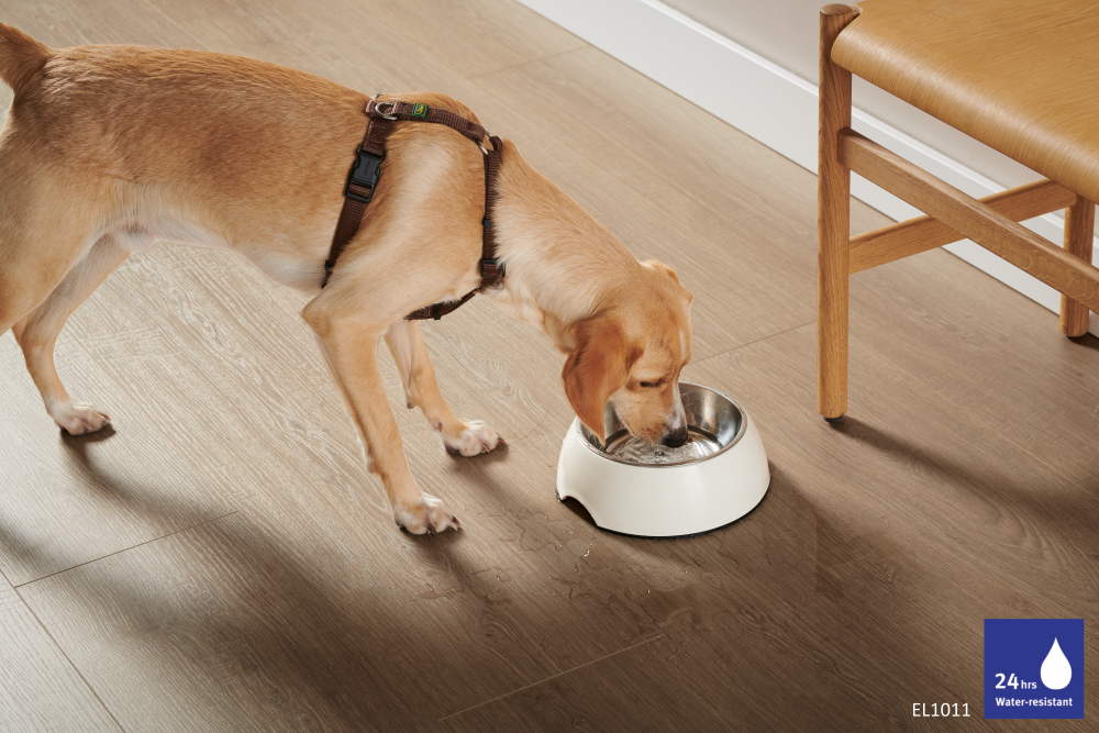 Nová podlaha od EGGERu je odolná voči vode až 24 hodín. Do tej doby akákoľvek vyliata tekutina uschne, alebo ju zotriete. Jadro tejto podlahy tvorí z dreva vyrobený materiál Quellstop. Povrchová úprava je z nepremokavého materiálu a okraje každej hrany sú ošetrené proti napučaniu pri kontakte s vodou. Tento častý jav spôsoboval ohýbanie starých laminátových podláh a povrch ste tak mali nerovný – a ponožky deravé. Nové, osem milimetrové laminátové podlahy EGGER s Aqua CLIC it! však zostávajú hladké a rovné. Pri montáži sa okraje zakliknú do seba spôsobom, ktorý za žiadnych okolností neumožňuje prienik vody. A vy, bez ohľadu či vám údržbovú výzvu spôsobujú deti, domáci miláčik, alebo nešikovný člen domácnosti, zostávate bezstarostní.
