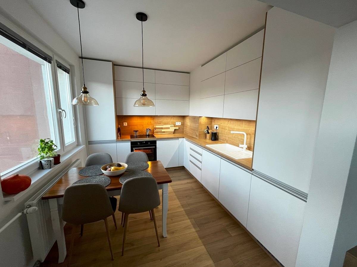 V malej kuchyni sa cení každý priestor a preto je jej nábytok „potiahnutý“ až po strop. Z praktického hľadiska vieme, že sa tým zbavíte miesta, kde sa len hromadí prach skombinovaný s mastnotou. No súčasne zväčšíte svoje cenné odkladacie priestory. Farebne sa skombinovala matná biela kuchynská linka s doskou v drevodekore. Škandinávska jednoduchosť a čistota na liptovský spôsob. Fotky presvedčia o tom, že naši kolegovia v KRT sú vyškolenými odborníkmi na kuchynské linky, ktoré realizujú do posledného praktického detailu.