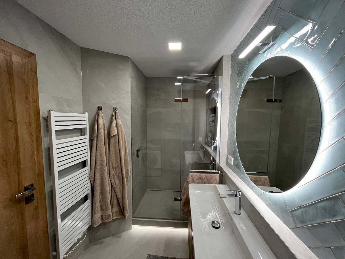 Keď sa ocitnete v kúpeľni a kuchyni tohto mladého páru, ani vám na um nezíde, že sa nachádzate v panelákovom byte. V kúpeľni vynikajú zelenkavé tehličky uložené do vzoru chevron s okrúhlym podsvieteným zrkadlom. To celé je skombinované so sivou dlažbou. K tomu sa ako doplnok výborne hodí drevodekor. Všetko dopĺňa biela sanitárna keramika, chrómové vodovodné kohútiky a praktický radiátor pre vždy príjemne teplé uteráky.