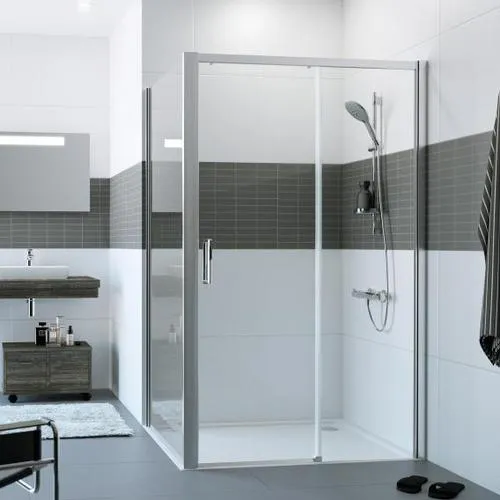 Dvere TIME2 NEW 120x200cm posuvné 1-dielne s pevným segmentom v pravo profil strieborný pololesklý sklo číre Anti-Plaque (C25609069322)