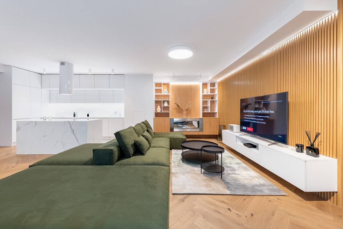 V bratislavskom byte našli veľkoformátové obklady kreatívne použitie aj na kuchynskom pulte. Pri použití rovnakého materiálu na zadnú stenu kuchynskej linky sa dizajnérom z OVA studio podarilo vytvoriť veľmi moderne, čisto a jednoducho pôsobiaci priestor. Nebolo však potrebné robiť kompromisy v praktickosti – povrchy sa ľahko udržujú, čistia a sú vysoko odolné voči poškodeniu.